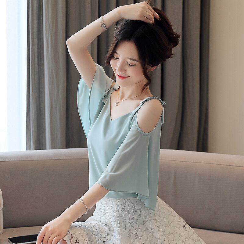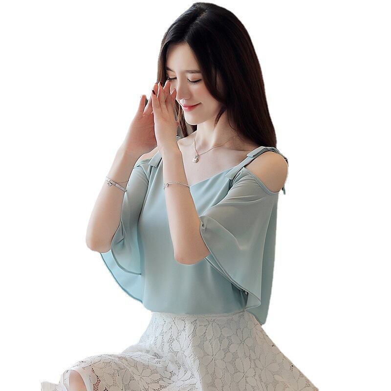 オープンショルダー シフォンフレアトップス