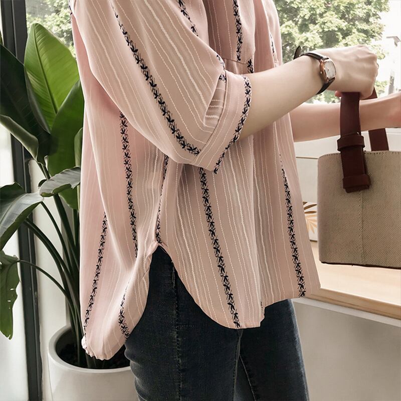 縦のラインを活かしたデザインが、全体をすっきりと見せてくれるストライプブラウス。