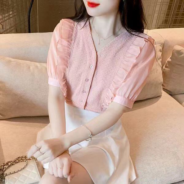 身頃はすっきりとしたシンプルな仕上がりにしつつ、袖にはシアー素材×フリルを組み合わせ、軽やかさと華やかさをプラスしています。甘くなりすぎない切替デザインなので、大人の女性にも取り入れやすいバランス感が魅力です。