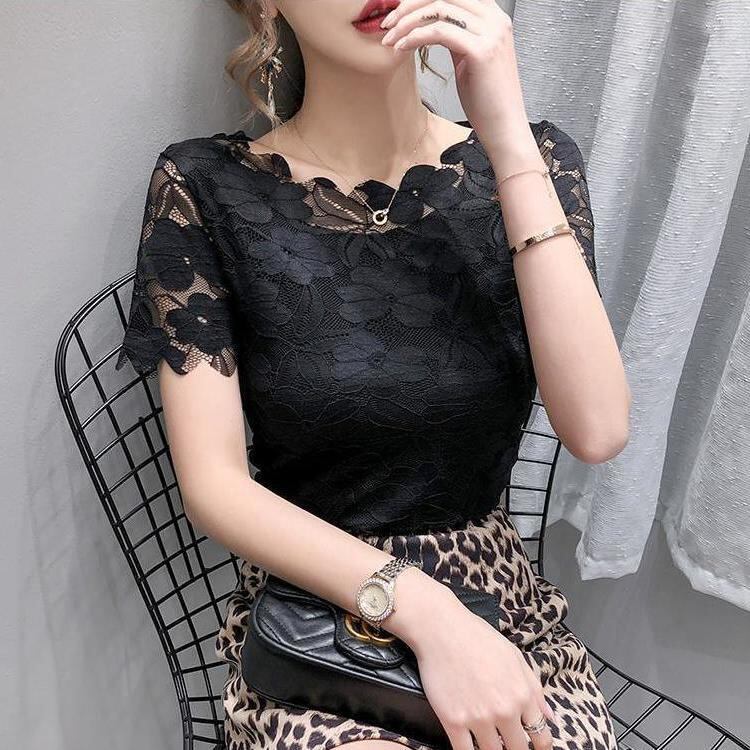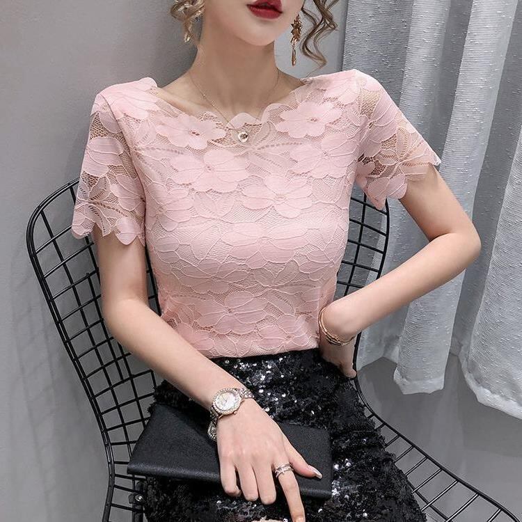 繊細なフラワーレースが全面にあしらわれた、上品な印象の半袖トップス。