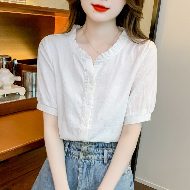 首元には控えめなフリルをあしらい、顔まわりを優しく見せつつ、きちんと感もプラス。フロントボタン仕様で着脱しやすく、前を少し開けて抜け感のある着こなしも楽しめます。袖は程よいボリュームの半袖デザインで、二の腕を自然にカバーしながら軽やかな印象に。
