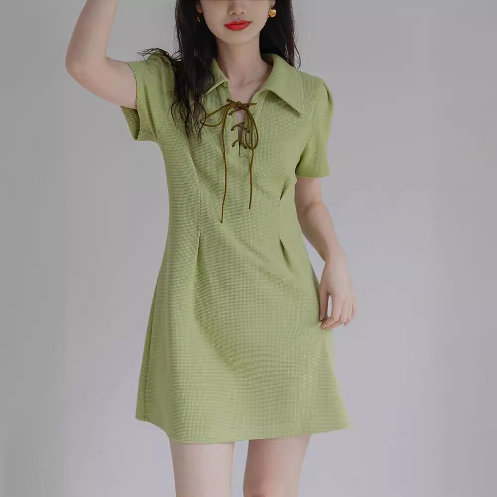 レースアップネック フレンチスリーブミニワンピース