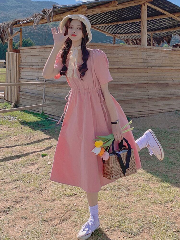 パフスリーブ ギャザーフレアワンピース