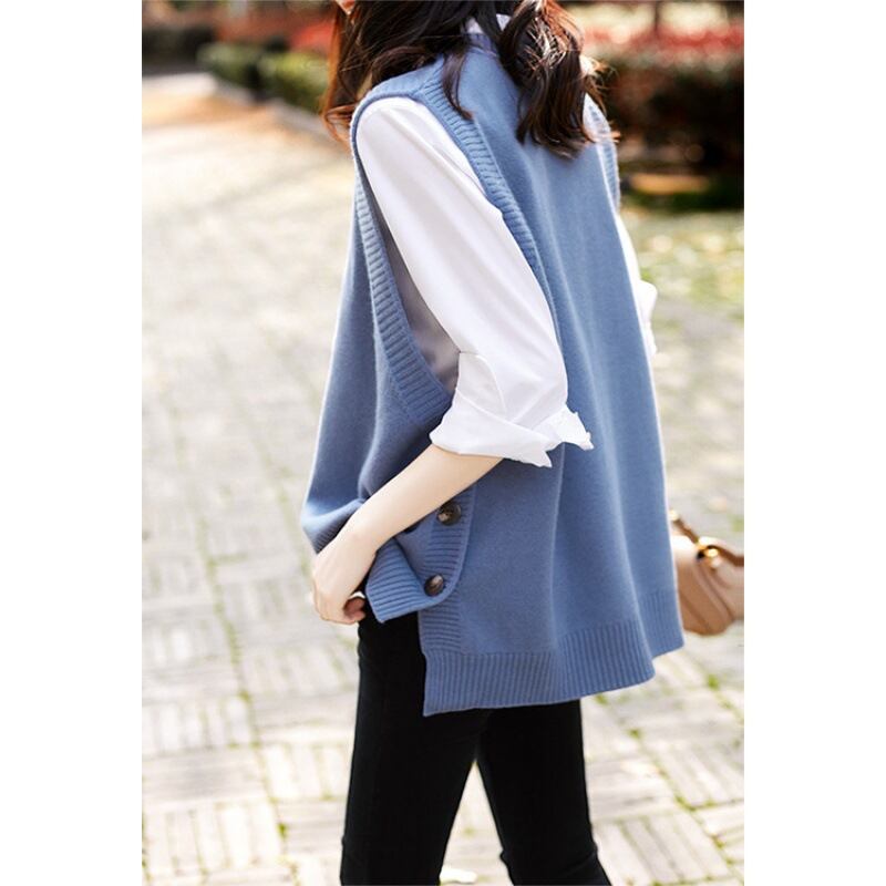 シンプルな中にさりげない表情を添える、サイドボタンデザインのニットベスト。