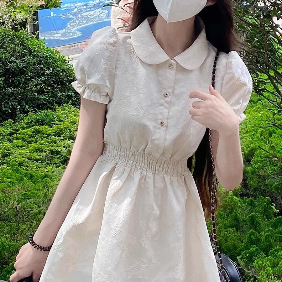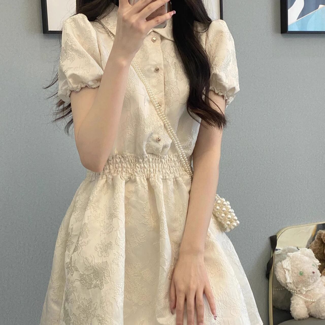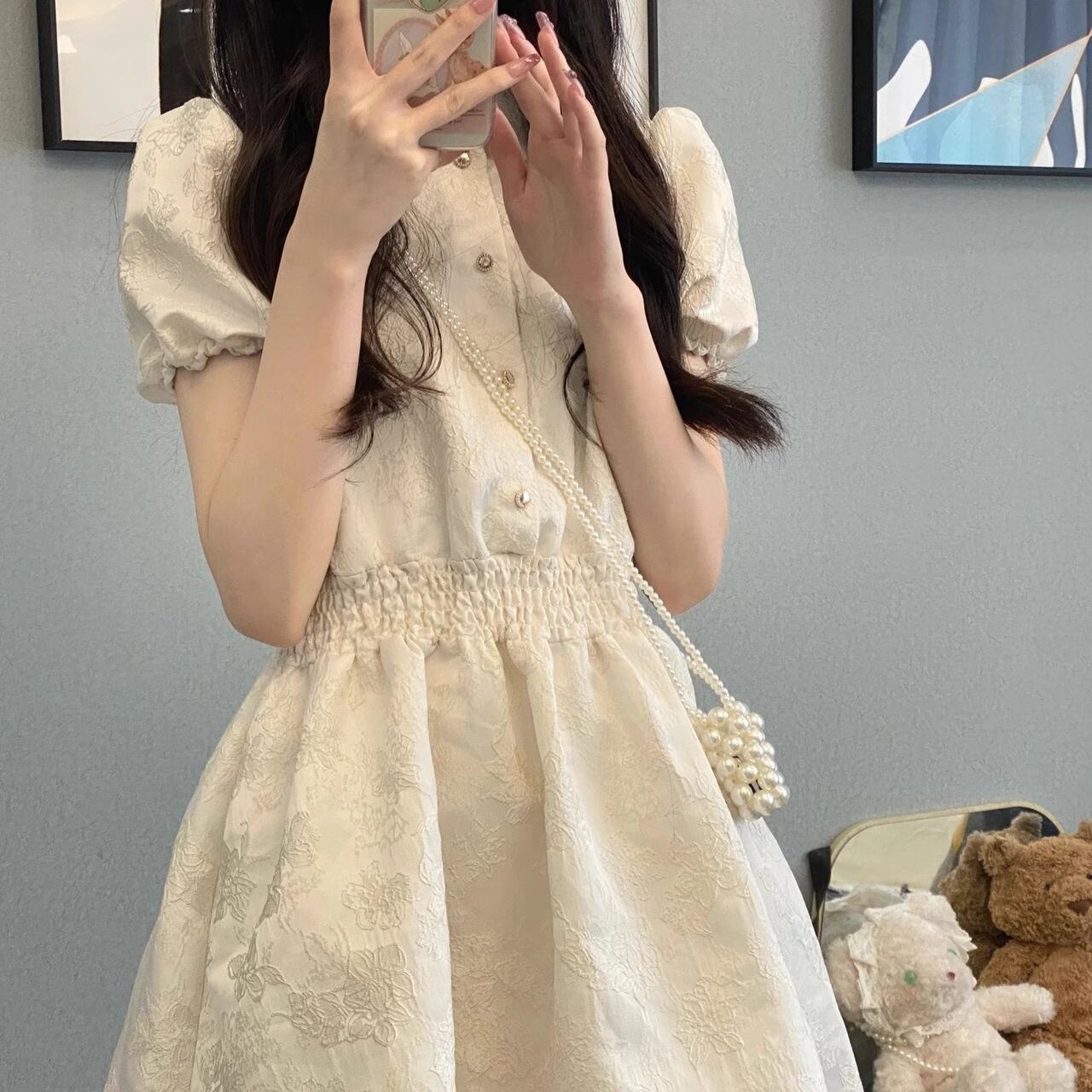 フロントに並んだパールボタンが、クラシカルで清楚なアクセントに。