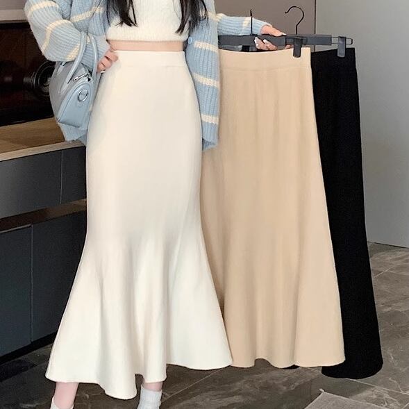 すっきりとした腰まわりから、膝下で自然に広がるマーメイドシルエットが、女性らしい曲線を美しく引き立てます。