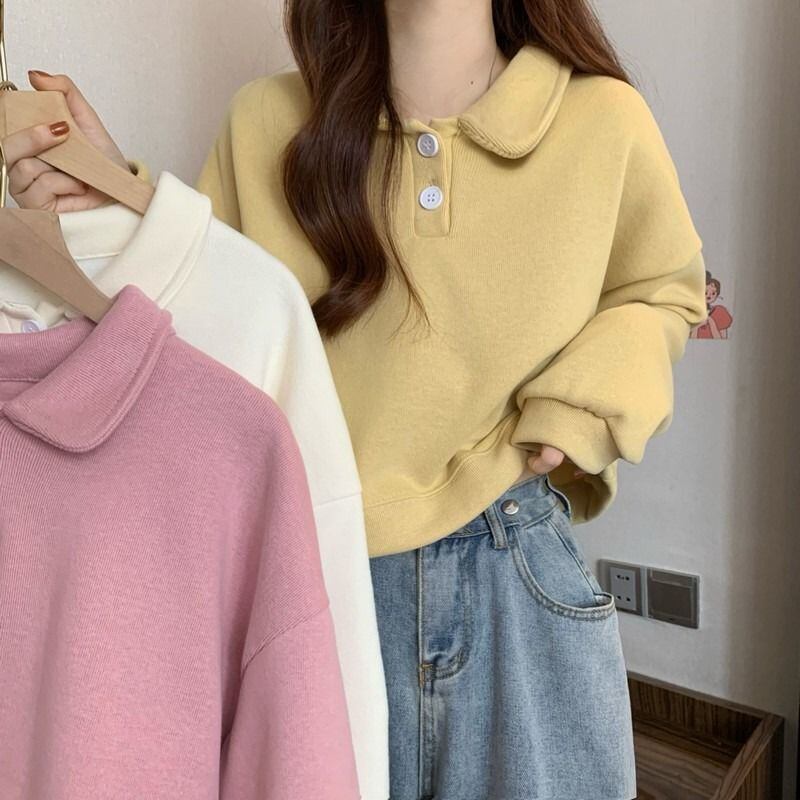 丸みのある襟デザインが顔まわりを優しく見せ、カジュアルなスウェットにほんのりフェミニンなニュアンスをプラス。フロントのボタンディテールがさりげないアクセントになり、シンプルながらも埋もれない一枚に仕上げました。