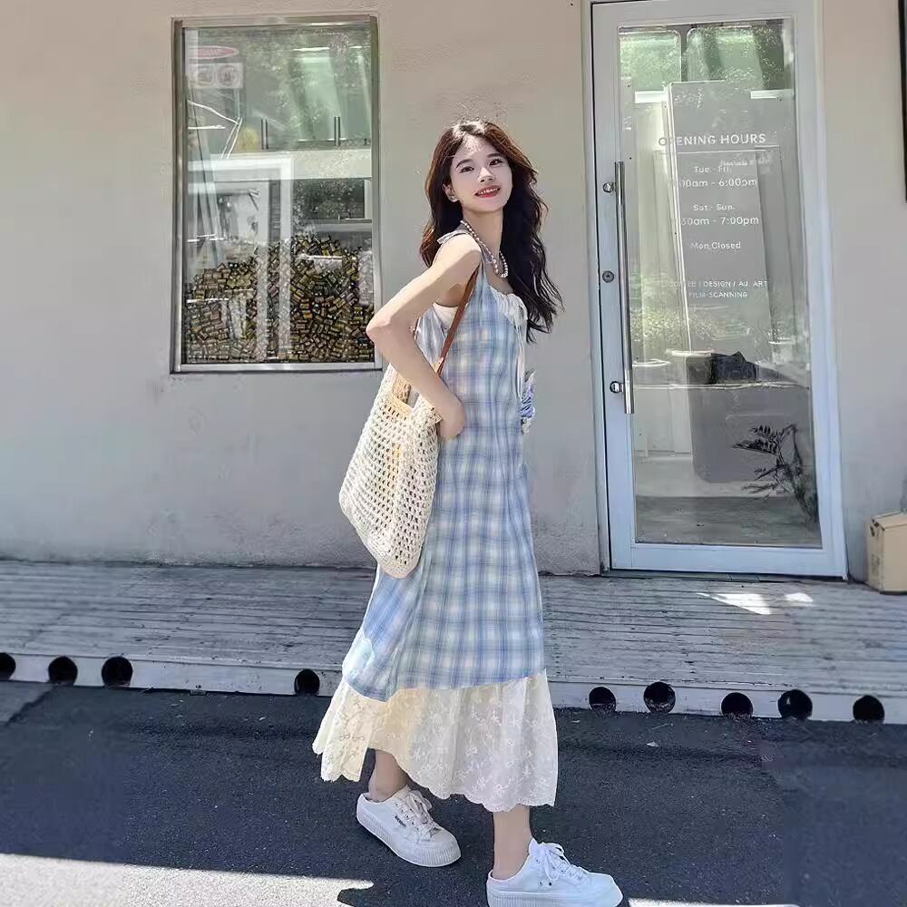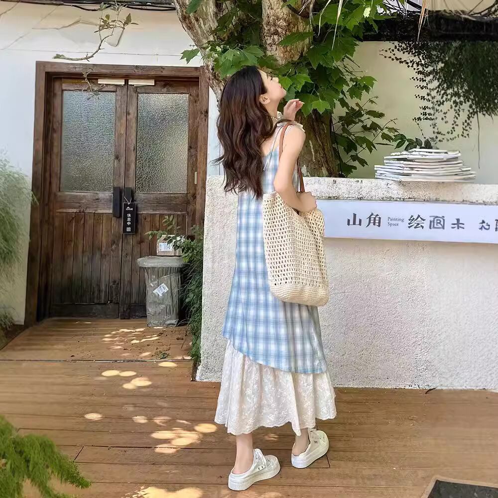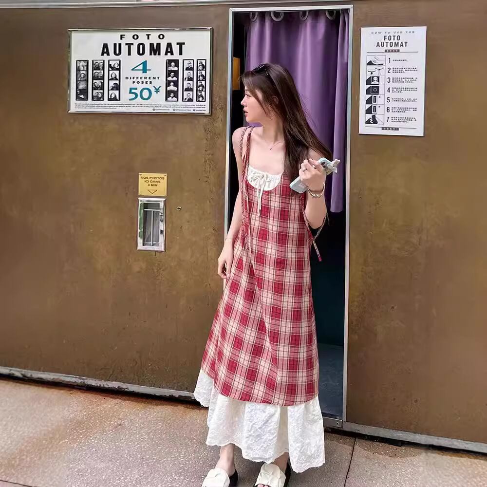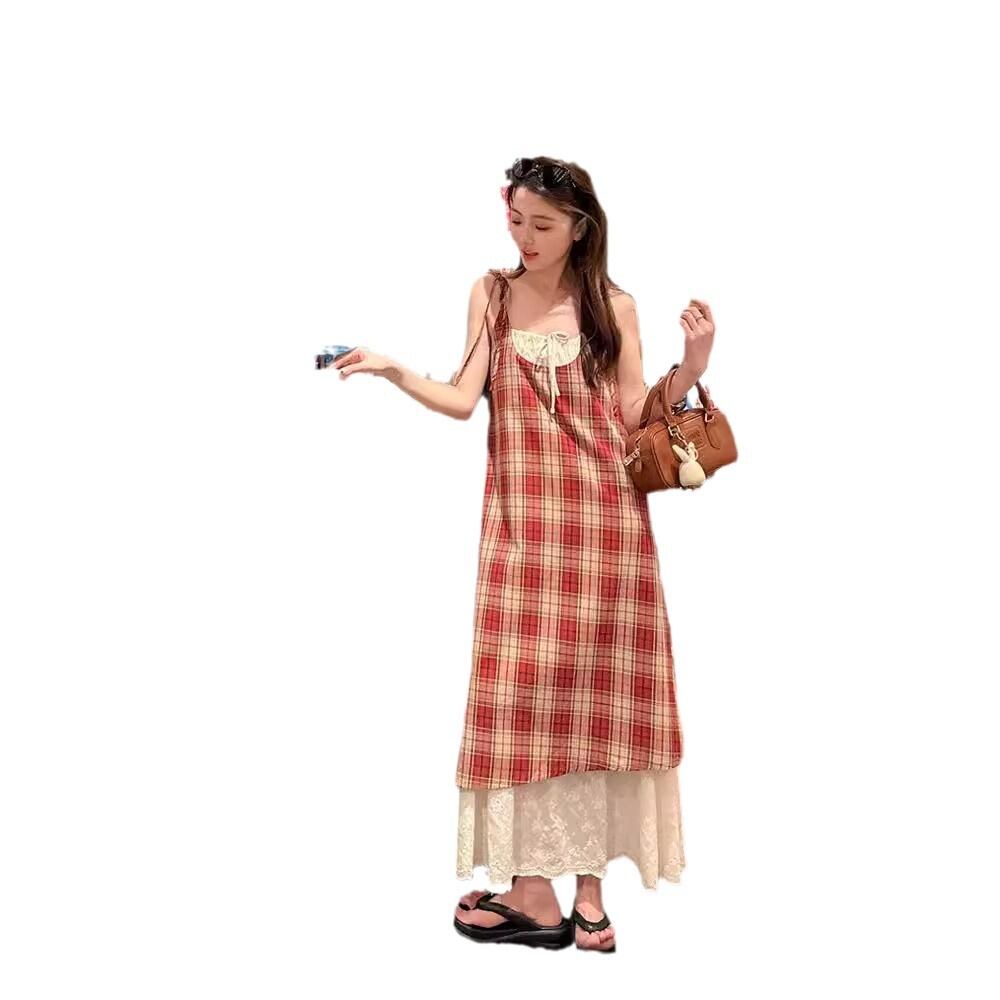 軽やかなチェック柄に、繊細なレースを重ねたレイヤードデザインが魅力のキャミワンピース。