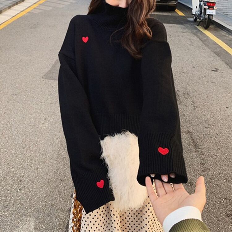首元をやさしく包み込むタートルネックは、暖かさと上品さを兼ね備えたデザイン。顔まわりをすっきりと見せながら、シーズンムードも高めてくれます。ゆるやかなシルエットと程よいボリュームスリーブが、抜け感のある女性らしい印象を演出。袖口にあしらわれたハートディテールも、動くたびに視線を引くさりげないアクセントです。