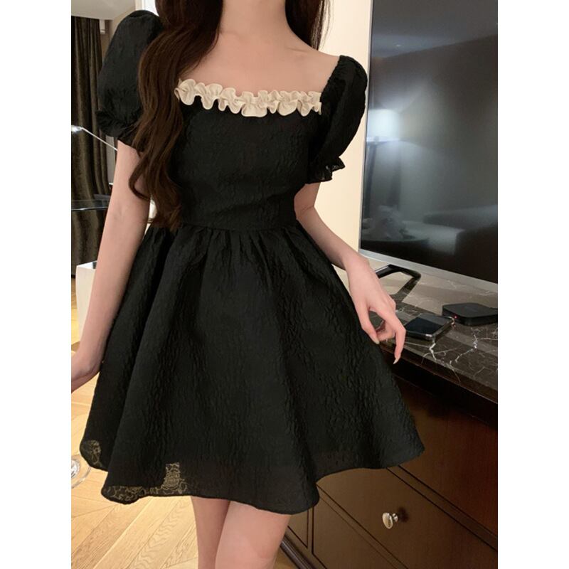 コンパクトなトップと、ふんわりと広がるフレアシルエットが自然なくびれを演出。パフスリーブがやわらかな女性らしさを添え、立体感のある美しいバランスを叶えます。バックスタイルに視線を集めるデザインで、どの角度から見ても抜かりのない印象に。