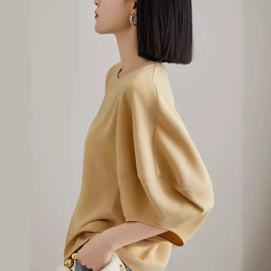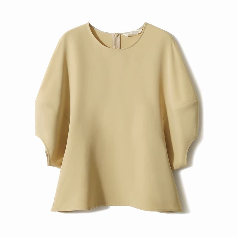 シンプルなデザインながら、ふんわりと丸みを帯びた袖がさりげなく存在感を放ち、上品で女性らしい印象に仕上げてくれます。動くたびに自然なドレープが生まれ、横から見たシルエットまで美しく演出します。