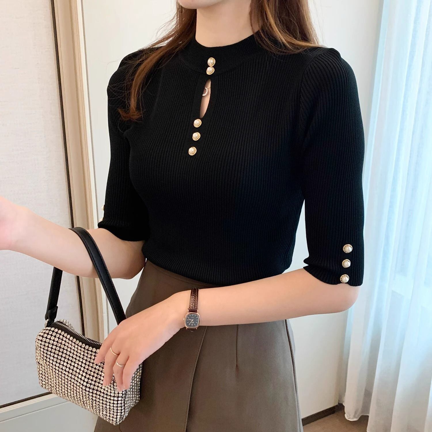 フロントに縦に並んだパールとさりげないネックデザインが、顔まわりをすっきりと見せながら華やかさを添えてくれます。シンプルな中に女性らしさを詰め込んだ、大人フェミニンな一枚です。