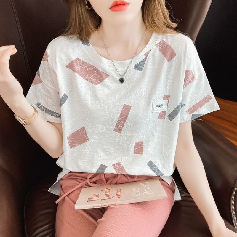 ランダムに配置されたアートプリントが目を惹く、ニュアンスアート プリントTシャツ。