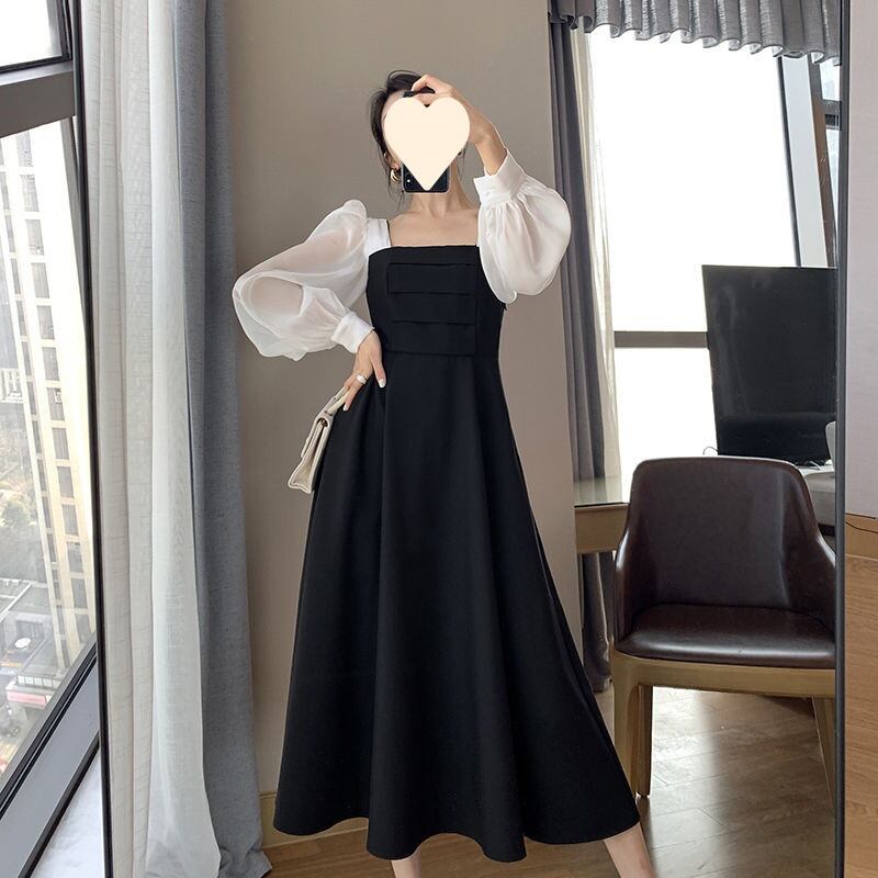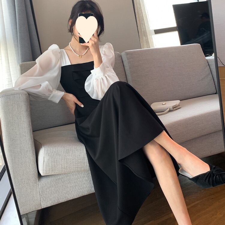 コントラストの効いた配色が印象的で、シンプルながらも視線を惹きつけるロング丈ワンピースです。