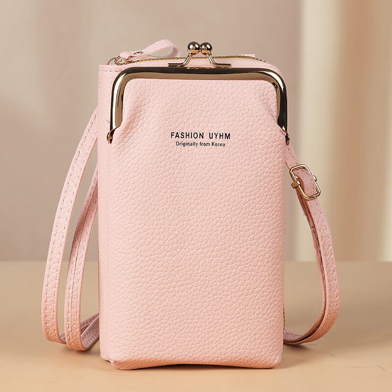 パチンと開閉できるがま口仕様は、中身が見やすく出し入れもスムーズ。スマートフォンはもちろん、カードや小さめのお財布など、必要なものをコンパクトにまとめられる設計です。背面や内側のポケット使いで、細かなアイテムも整理しやすいのが嬉しいポイント。