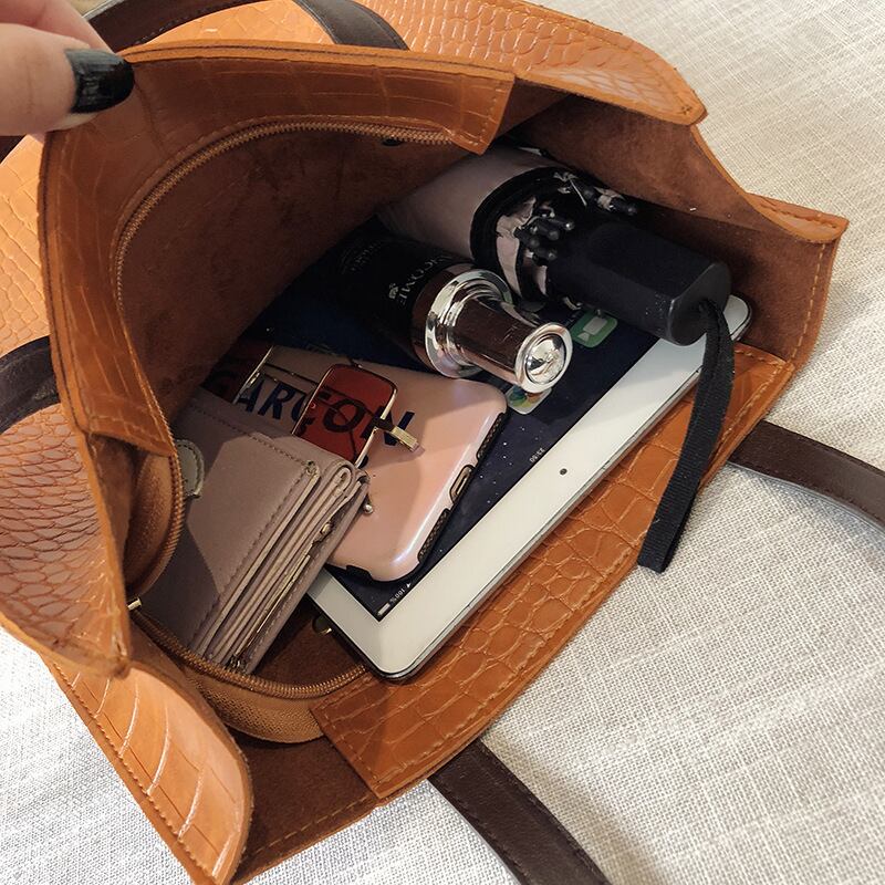 表面に施されたクロコ調の型押しが、シンプルなフォルムに奥行きをもたらすトートバッグ。直線的なシルエットが全体をすっきりと見せ、都会的なムードをさりげなく漂わせます。