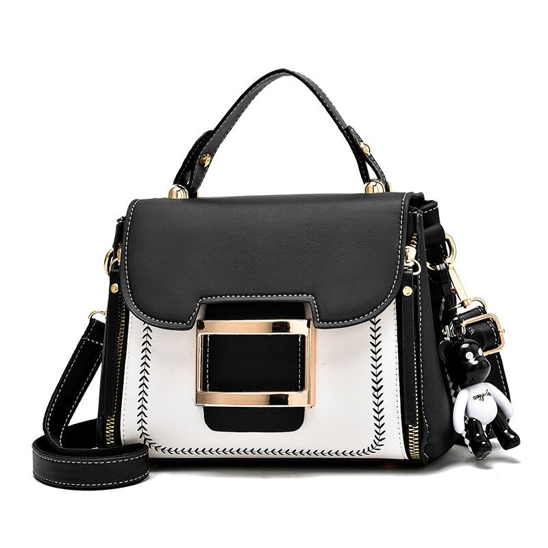 すっきりとしたスクエアフォルムに、コントラストを効かせたバイカラーデザインのバッグ。
