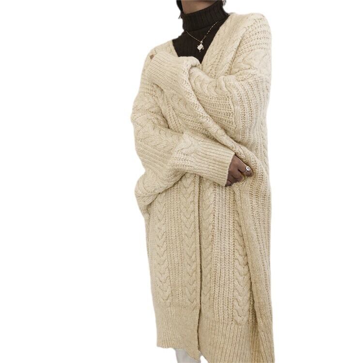 立体感のあるケーブル編みが縦のラインを美しく引き立てる、存在感のあるロング丈の一枚。