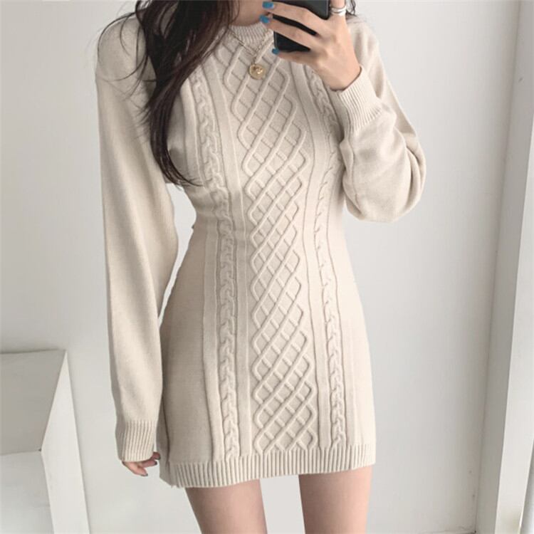 フロントに施されたケーブル編みが立体的な表情を生むタイトニットワンピース。