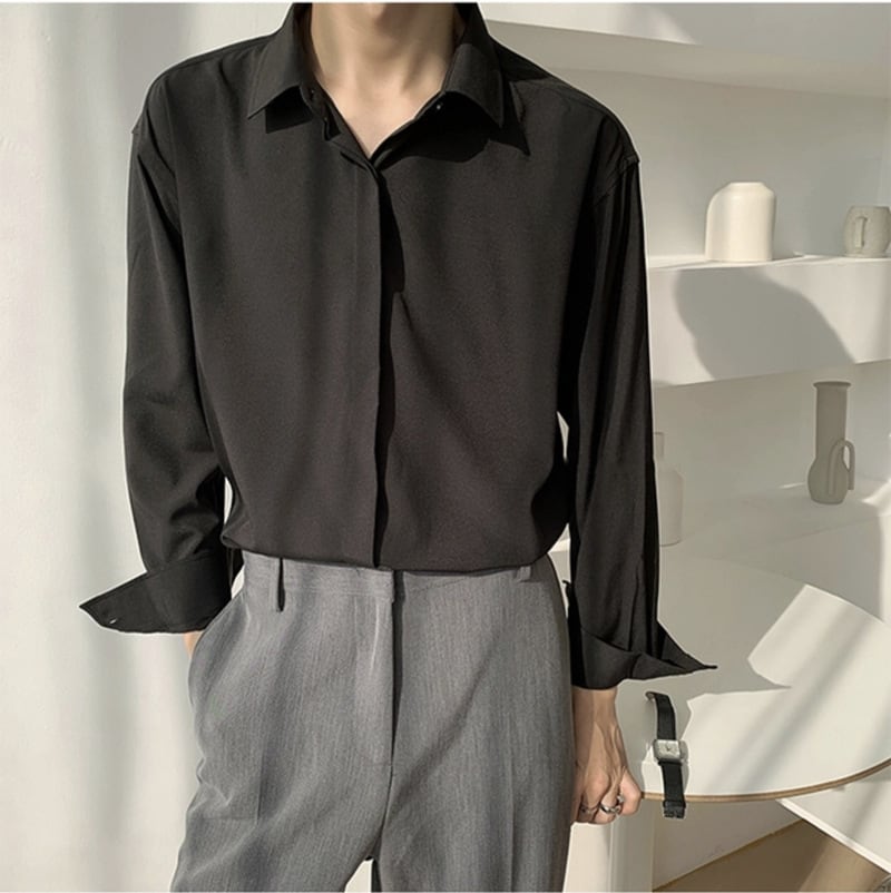 ブラックならではの引き締まった印象に、オーバーサイズの余白を重ねたドレープシャツです。