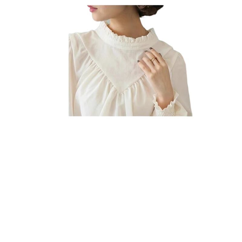 首元にあしらった繊細なフリルが、顔まわりを印象的に彩るブラウス。