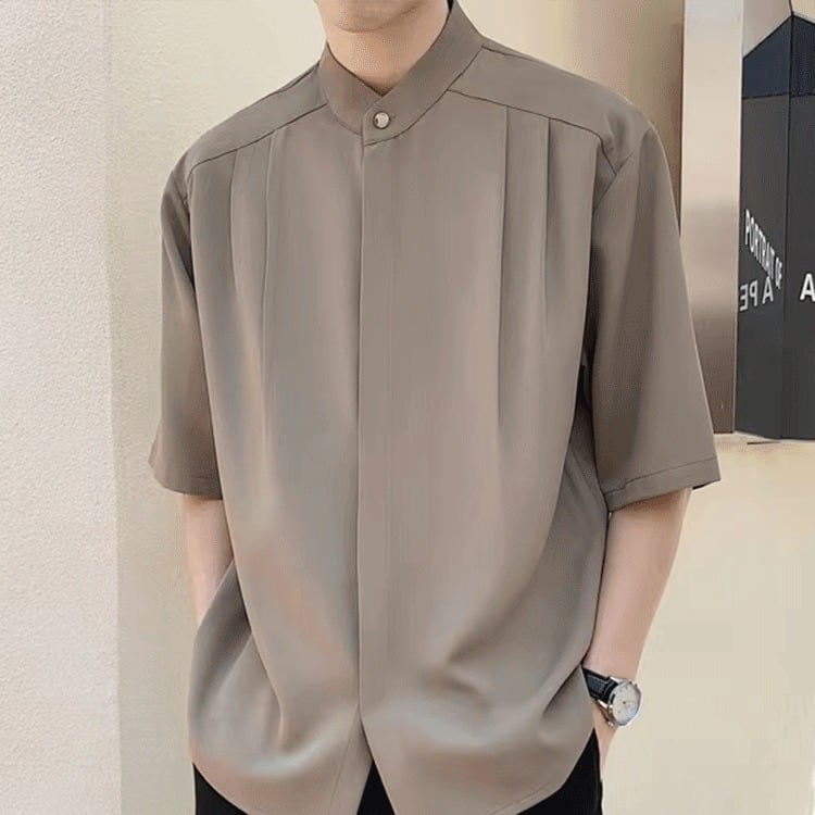 フロントに施されたタックデザインが印象的な、バンドカラーシャツ。