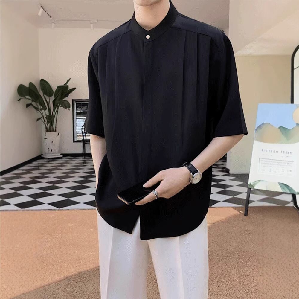 首元をすっきり見せるバンドカラーと、縦に入ったタックラインが全体の印象をスマートに整えてくれるデザイン。程よくゆとりのあるシルエットで、リラックス感のある着心地も魅力です。スラックスと合わせた落ち着いたコーディネートはもちろん、デニムやワイドパンツと組み合わせても自然に馴染みます。