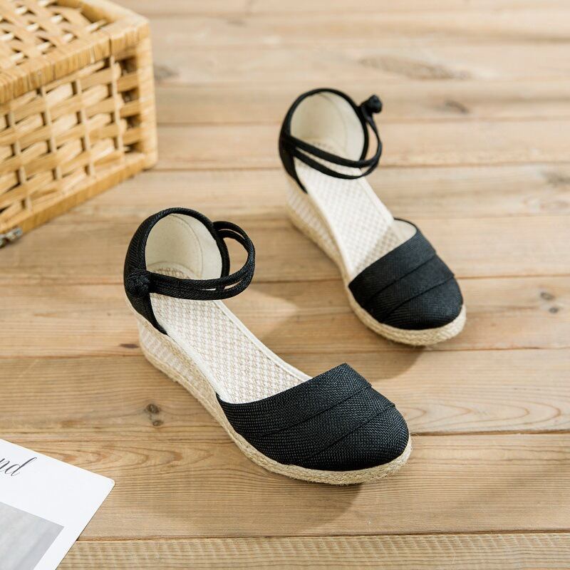 ナチュラルな風合いの素材とジュートソールを組み合わせた、軽やかな印象のウェッジパンプス。