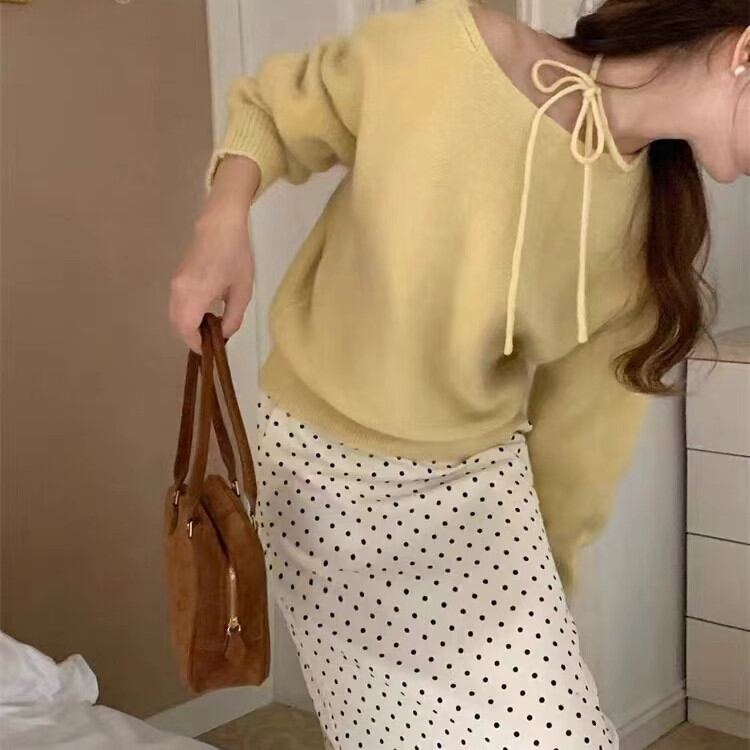 やわらかなニット素材とゆったりとしたシルエットが、肩まわりに自然な落ち感を生み、リラックスした雰囲気をプラス。ネック部分のリボンは結び方によって表情が変わり、スタイリングにさりげない変化を添えてくれます。