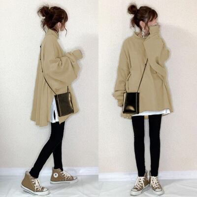 首元までやさしく包み込むハイネックが、シンプルな中にさりげないアクセントをプラス。ボリュームのある袖とゆとりのある身幅がバランスよく、抜け感のあるシルエットに仕上がっています。