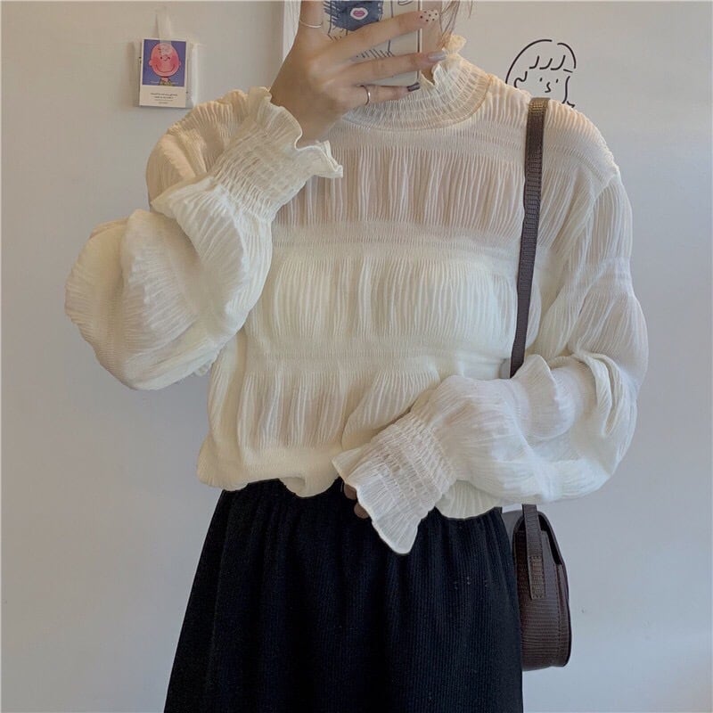 やわらかな透け感が軽やかな印象を与えるハイネックブラウス。