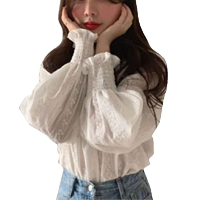 首元は控えめなフリルデザインのハイネックで、顔まわりをやさしく印象づける仕上がり。ふんわりとしたボリュームスリーブと袖口のシャーリングが、ほどよい立体感を生み出します。